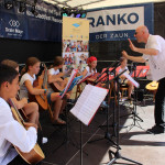 Etwas später spielte unser neu gegründetes Gitarrenorchester unter der Leitung von Bert Lederer auf. Der Marktplatz war heiss, die Bühne gab noch etwas Schatten und die jungen Gitarrist:innen spielten engagiert, konzentriert und mit viel Spaß für die Menschen im Schatten untern den Schirmen oder des Rathauses.