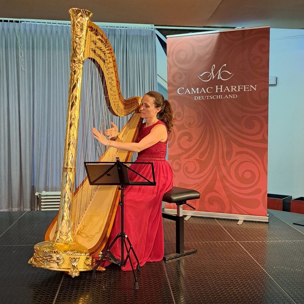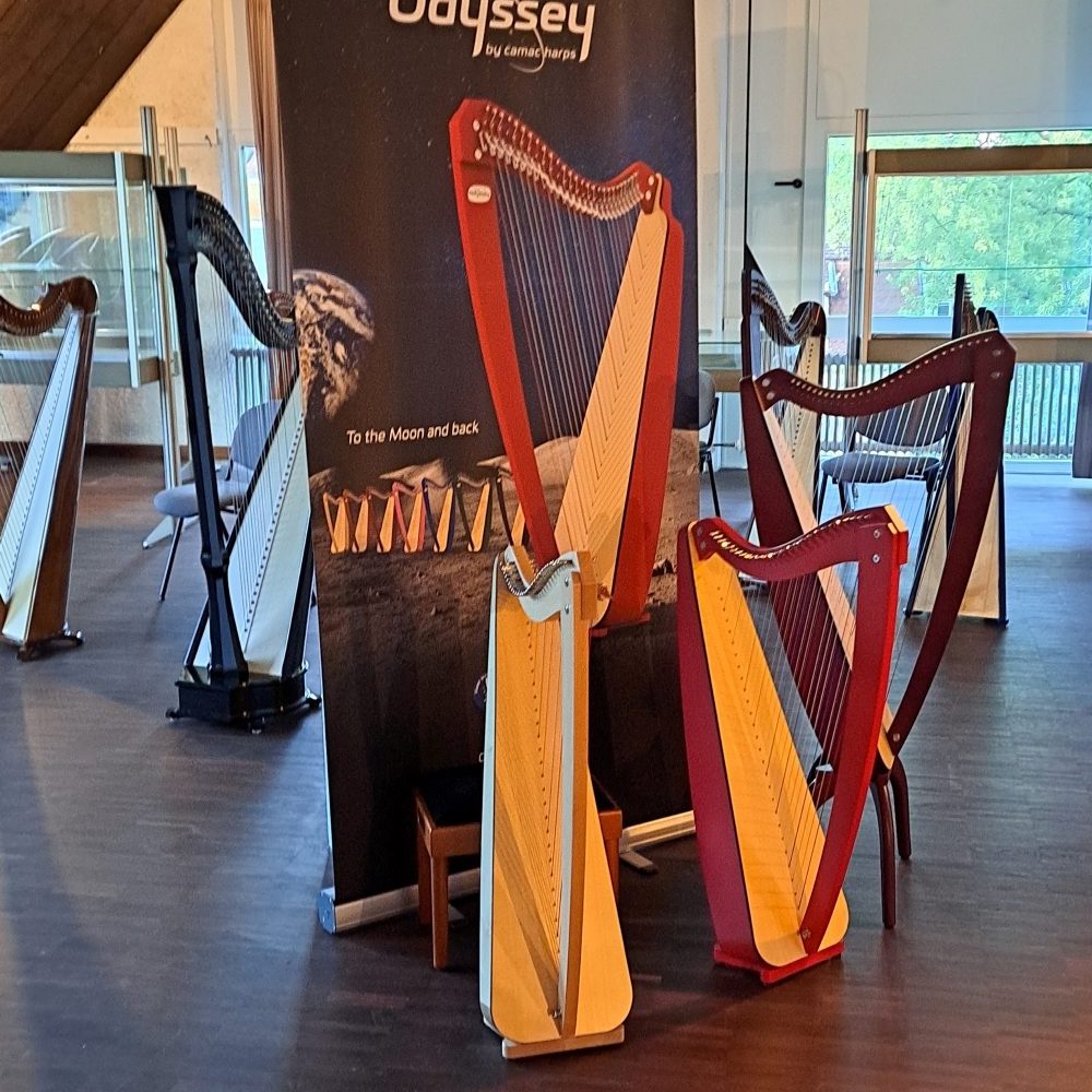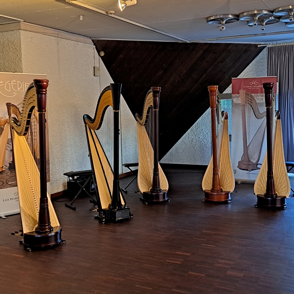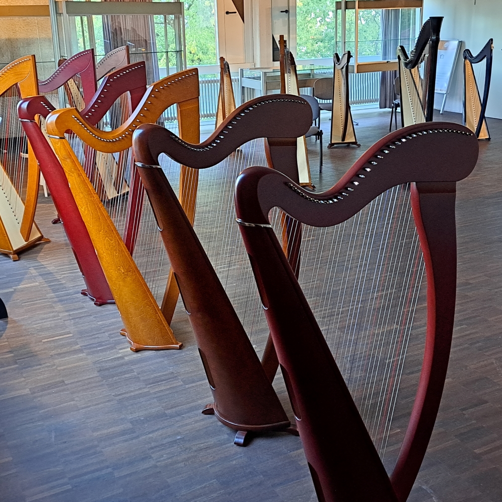 Das aus Berlin angereiste Team um Julia Becker brachte die ganze Vielfalt französischer Harfenbaukunst mit – von Reise- über Haken- bis hin zur Pedalharfe, von akustisch bis elektrisch. Besucherinnen und Besucher hatten die Gelegenheit, nach Herzenslust auszuprobieren, Instrumente auszuleihen oder zu erwerben. Auch bereits im Besitz befindliche Harfen konnten kostenlos reguliert werden.