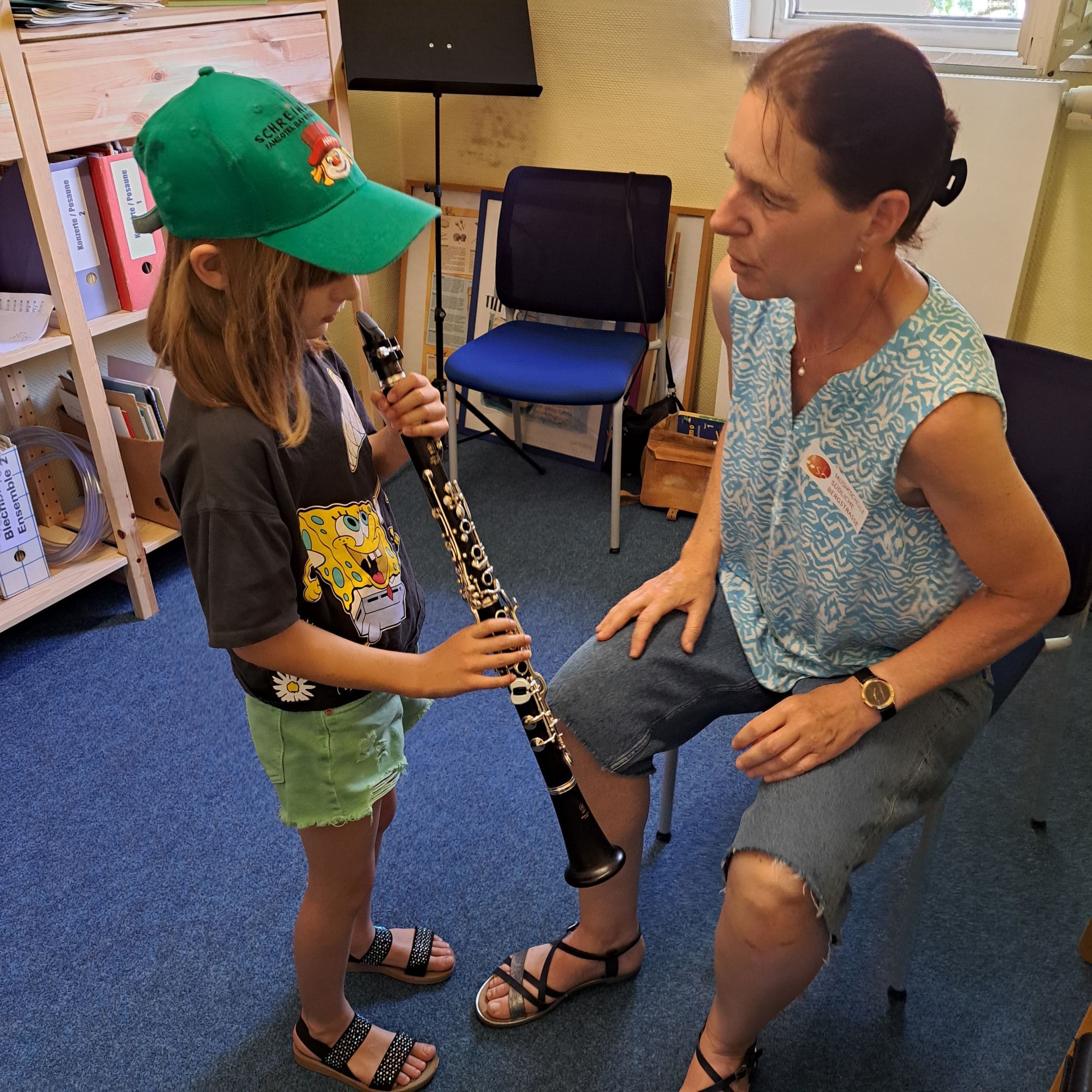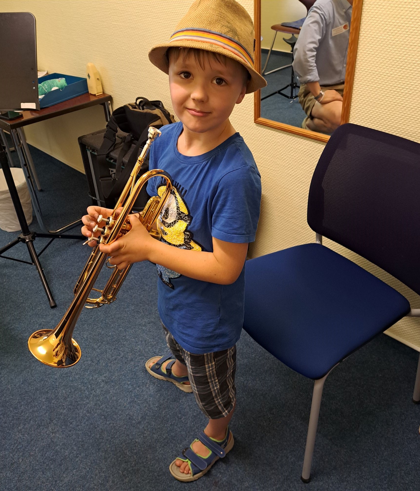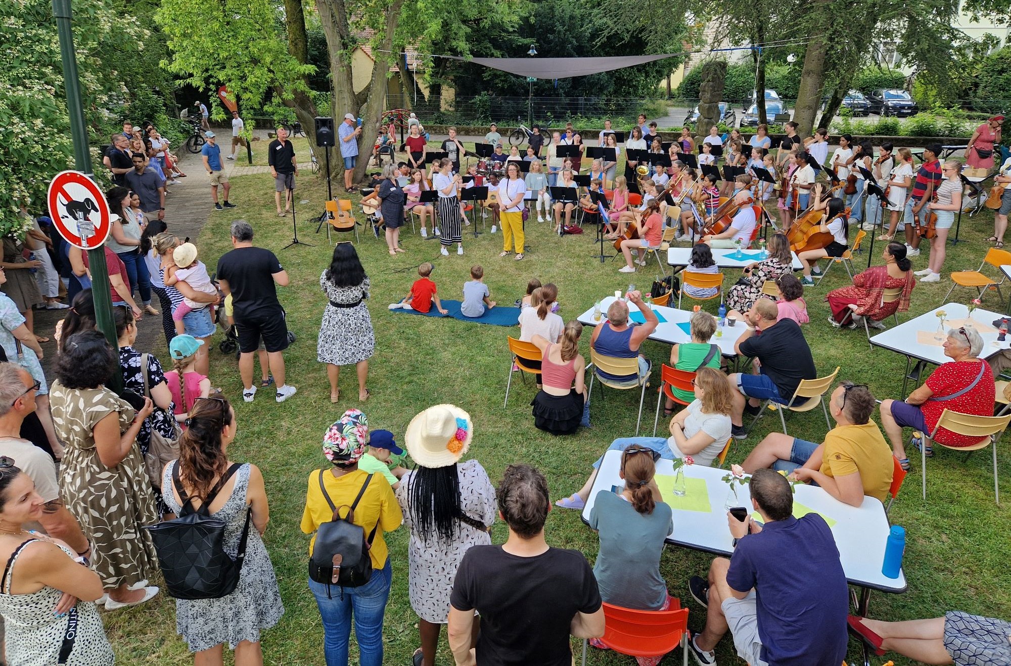 Wiesloch. (hds) Der traditionale „Tag der Instrumente“ bei der Musikschule Südliche Bergstraße wurde in diesem Jahr erweitert und erhielt eine neue Überschrift: „Kinderkulturfest – Kommen-Hören-Sehen-Probieren“. Mit eingebunden waren außerdem die Stadtbibliothek und die Kinderkunstschule (KIKUSCH). Los ging es bei hochsommerlichen Temperaturen in der Amarante-Anlege mit dem Auftritt eines Mitmachorchesters, um den zahlreichen Gästen akustisch das Zusammenspiel unterschiedlicher Instrumente aufzuzeigen. Vor allem Eltern mit ihrem erwartungsvollen Nachwuchs waren gekommen, um mal in das umfangreiche Angebot der Musikschule zu schauen. „Wir haben wegen der Hitze eigens ein Sonnensegel aufgestellt, um das Orchester einigermaßen zu schützten“, so Nadine Bösing, die im September des Vorjahres die Leitung der Musikschule übernommen hatte. Nach dem Aufspielen ging es dann in die benachbarte Villa und in die oberen Räume des Kulturhauses, dem Unterrichtsdomizil der Musikschule Südliche Bergstraße. Dort boten die Lehrerinnen und Lehrer der Einrichtung ein „Schnuppern“ an und zwar über eine Vielzahl von Instrumenten hinweg. Ob Harfe, Gitarre, Klavier, Trompete bis hin zum Klavier war alles vertreten. Selbst Popgesang und natürlich Schlagzeug wurden präsentiert. Information und selbst ausprobieren bestimmte das Geschehen in vielen Räumen. „Wir haben den „Tag der Instrumente“ bewusst ausgeweitet, um so unser gesamtes Spektrum besser vorstellen zu können“, erklärte Bösing. Es komme sogar hin und wieder vor, dass Kinder, die sich eigentlich im Vorfeld für ein bestimmtes Instrument entschieden hatten, nach den Vorführungen und Erläuterungen umgeschwenkt seien. „Wichtig ist auch: Wir haben mit fast allen Grundschulen in unserem Zuständigkeitsbereich Kooperationen, so beispielsweise mit der Merian-Grundschule in Wiesloch. Dort bieten wir unter anderem eine Bläserklasse an“, informierte Bösing. Seitens der Stadtbibliothek hatte man sich etwas Besonderes einfallen lassen. „Wir bieten heute spannende Geschichten mit dem Kamishibai an, einem alten, japanischen Erzähltheater. Dies besteht aus einem Holzrahmen, in den verschiedene Bilder eingeschoben werden“, so Claudia Kellner von der Stadtbibliothek. Dadurch würde die Sprache der Kinder und die kreativen Aktivitäten gefördert. Ergänzend bot die Kinderkunstschule mit Frau Senft-Rubarth an einer Malstation Mitmachmöglichkeiten zum freien Gestalten an. Dieses Angebot wurde ebenfalls sehr gut angenommen und es entstanden schöne Bilder mit und ohne Musik. Bei so viel Bewegung und Aktion wurde so Mancher hungrig und durstig. Der Verein der Eltern und Förderer der Musikschule versorgte die zahlreichen Gäste mit kühlenden Getränken, Kaffee und Kuchen. Das Fazit: Das Angebot, unter fachlicher Anleitung die unterschiedlichsten Instrumente auszuprobieren, um dann vielleicht später selbst in eine weiterführende Lernphase einzutreten, wurde bestens genutzt.