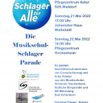 Bei der Musikschul – Schlagerparade der Musikschule Sinsheim, der Musikschule Hockenheim und der Musikschule Südliche Bergstraße spielten Querflötenschüler von Cornelia Herzog und Anke Palmer am vergangenen Samstag und Sonntag, 21. und 22. Mail 2022 im Pflegezentrum Astor in Walldorf, dem Johanniterhaus in Waibstadt und dem Pflegezentrum in Hockenheim mit bekannten Schlagern zur Freude der BewohnerInnen und Angestellen. Begleitet am Klavier wurden sie von Christian Palmer am Klavier.