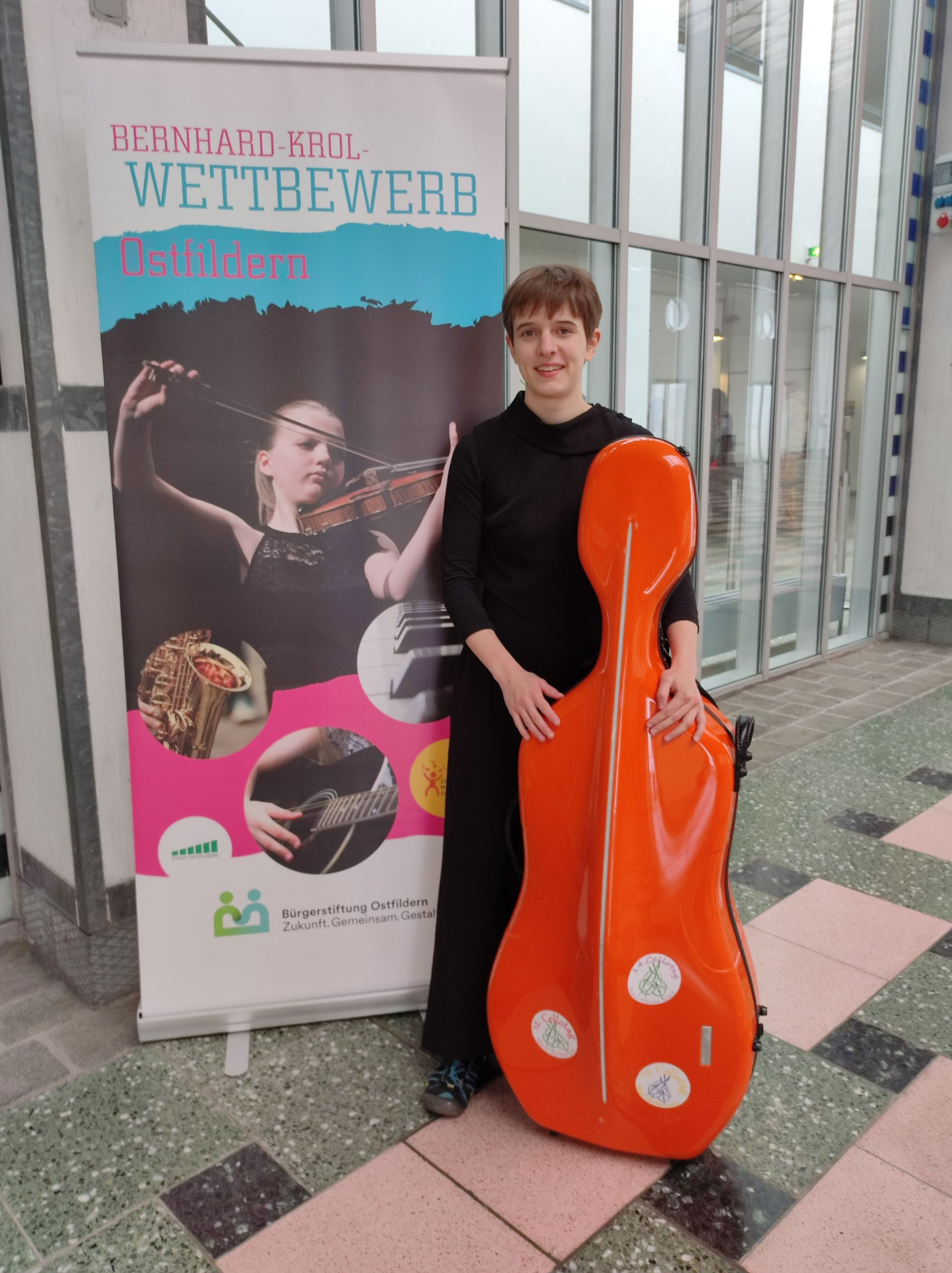 Tabea Reich, Klasse Brygida Lorenz durfte am 8.11. am Krol-Wettbewerb teilnehmen, der sich an Musizierende aller Instrumentengruppen aus Baden-Württemberg zwischen 12-19 Jahren richtet. Dies war deswegen eine besondere Erfahrung, da bei diesem Wettbewerb vor allem Wert auf die Darbietung eines zeitgenössischen Stücks gelegt wird. Es war ein Genuss kombiniert mit sehr interessanten Klangerfahrungen den Musizierenden, die allesamt auf höchstem Niveau spielten, zuzuhören. So nutzte beispielsweise eine Trompeterin die Resonanz einer Art Klangschale/Gong mit ihrem Trompetenton, was in dem akustisch und auch sonst sehr gut ausgestatteten Theatersaal in Ostfildern eine Bereicherung für die Zuhörenden bedeutete. Tabea musizierte sehr ausdrucksstark und gefühlvoll von Fortner die Solo Cellosuite mit 2 Sätzen und die Sonate in D-Dur für Cello und Klavier von Locatelli im 1. Satz mit der Begleitung von Brigitte Becker sehr virtuos und sehr erfolgreich. Der Bernhard Krol Wettbewerb dient neben der Förderung der Jugend dem Gedenken an den gleichnamigen Komponisten und Hornisten (1920-2013). Insgesamt war dieser Wettbewerb, der im Vergleich zu Jugend musiziert eher als klein eingestuft werden kann, durch sein hohes Niveau der Musizierenden und die vorgegebene Programmauswahl mit einem zeitgenössischen Stück und einem aus einer anderen Epoche ein besonderes Erlebnis. Zudem gab es neben Streichinstrumenten und Klavier, Akkordeon, Gitarre, Horn, Trompete, Tuba, Gesang, alle Holzblasinstrumente, Saxophon und Ensembles zu hören, was eine große Abwechslung und Vielfalt erbrachte.
