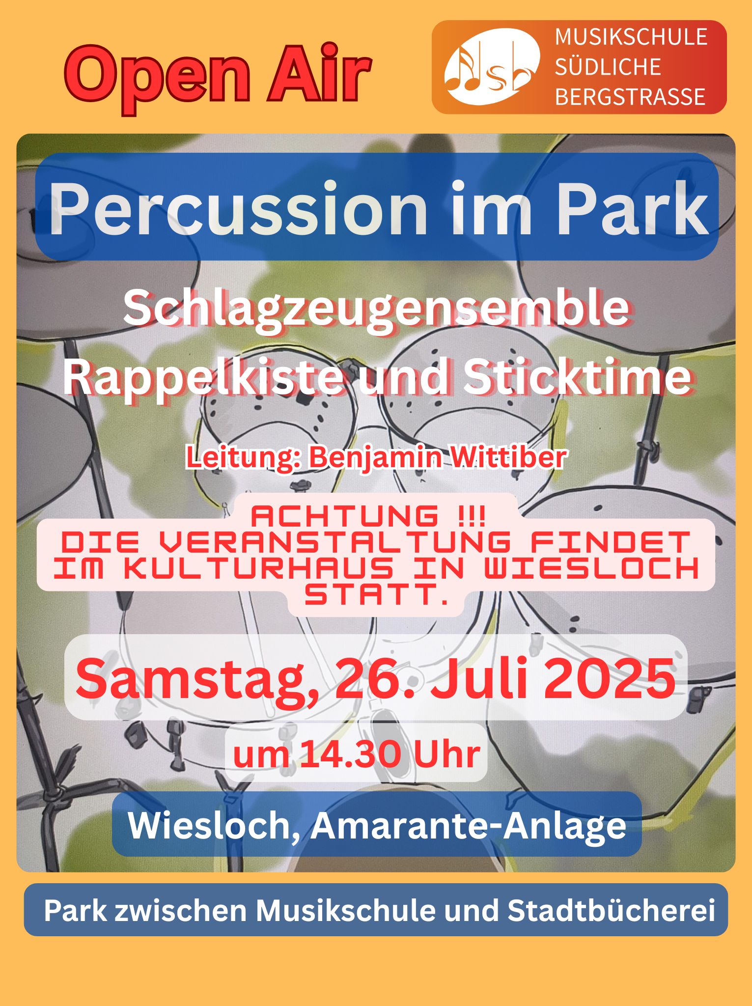 Es ist wieder so weit: Am Samstag, dem 26. Juli 2025, um 14:30 Uhr, laden die Schlagzeugensembles Rappelkiste und Sticktime unter der Leitung von Benjamin Wittiber zu einem besonderen Open-Air-Konzert ein, das in diesem Jahr wieder in der Amarante-Anlage- zwischen Musikschule und Stadtbibliothek – in Wiesloch stattfindet. Freuen Sie sich auf mitreißende Latin- und Poparrangements von Künstlern wie Stevie Wonder, Earth, Wind & Fire, Bruno Mars, Santana, Sting, Mongo Santamaria und Tito Puente. Unterstützt werden die jungen Schlagzeugerinnen und Schlagzeuger von einem Bläsersatz, der für ein zusätzliches musikalisches Highlight sorgt. Erleben Sie ein unvergessliches Konzert voller Rhythmus und Energie im Herzen von Wiesloch. Seien Sie gespannt auf einen Nachmittag, der Sie zum Mitwippen und Tanzen einlädt!